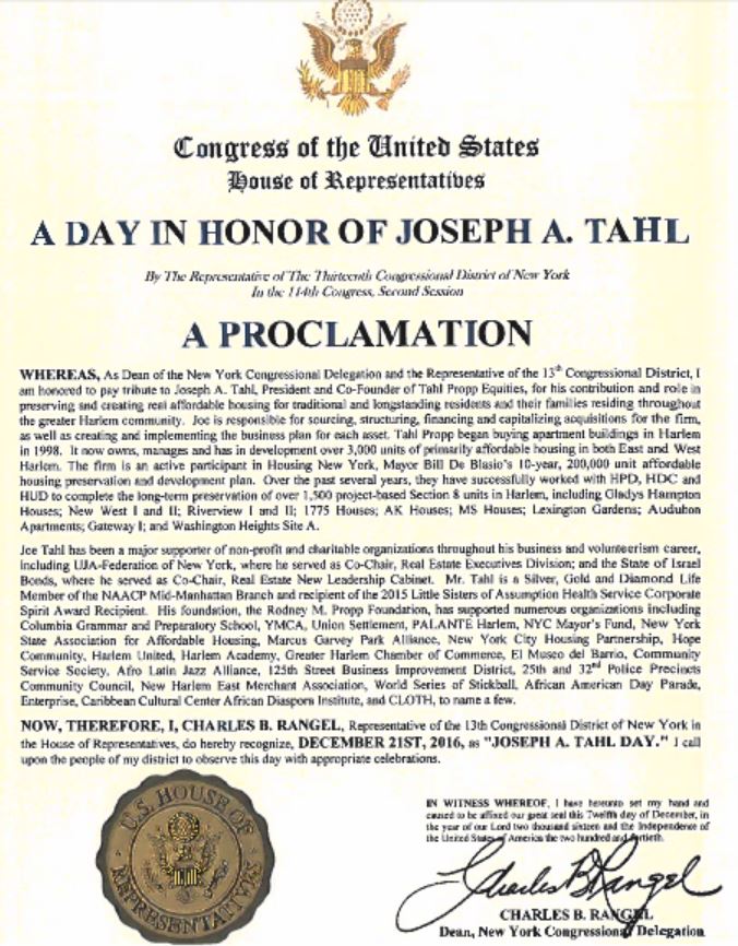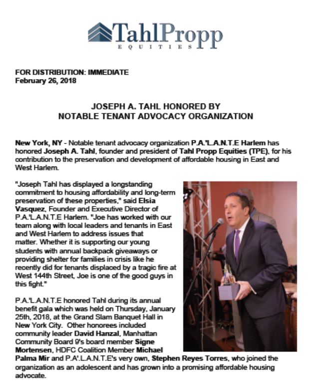 Joseph A. Tahl Honored by P.A.L.A.N.T.E. Harlem
