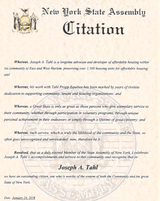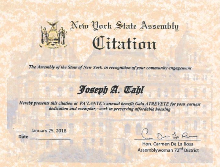New York State Assembly Citation In Honor of Joseph A. Tahl By Hon. Carmen De La Rosa